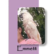 Emmett is a Moluccan cockatoo and has been an integral part of my life since he was weaned at about four months. Emmett started picking his feathers at about 2 years old, close to the time that we got a "brother" for Emmett. As the only sure way to know the sex of a cockatoo is by DNA sexing, we followed the common thinking that because both of our birds talked so well, that we had two males. We consulted with Jacqui, early in her training, and what a blessing she proved to be. "Pet parents" agonize over what we have done that has caused our pet to act out. Jacqui told us that Emmett was very happy with his home and his new brother Trés; however, he did not like the smell of the cleaner we used on his cage and most importantly, he wondered why we did not get him a favorite toy, which he described in great detail and that I recognized easily. One thing was not real clear at the onset - he said that we thought we lived with a boy, but we actually lived with a girl. My first inclination was that his "brother" was actually a girl. Later after having the birds sex determined, we were very surprised to find that Emmett was actually telling us that "he" was the girl. Jacqui's intuition in every instance was spot on - Emmett is no longer a feather picker. What a real blessing. Anyone with knowledge of feather pickers knows the difficulty of stopping this incessant habit. Jacqui was truly a blessing in our lives, and it is so wonderful to know that your pet is happy with his family and surroundings. Thank you again, Jacqui. ~ Joy S. |